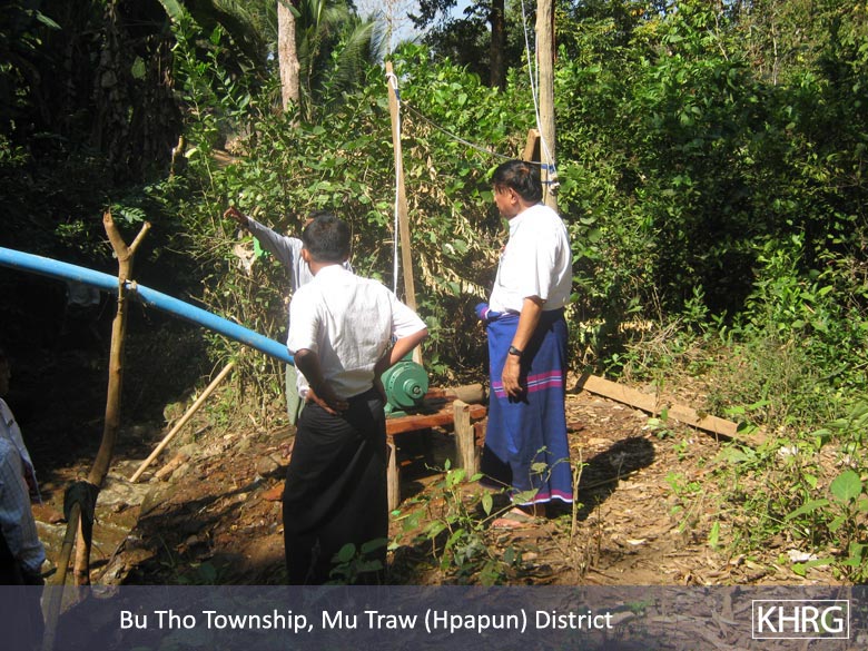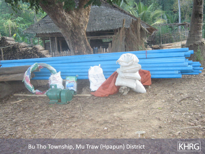 The photo above, left, was taken on February 11th, 2012 in C--- village, and shows pipes used as part of a Burma government development project introducing hydroelectric power in C--- village. The photo above right, taken on the same day, shows Papun District leader Saw Mya Htunt Way, pictured right in the blue longyi, observing the process of setting up the electricity supply in C--- village. [Photos: KHRG]