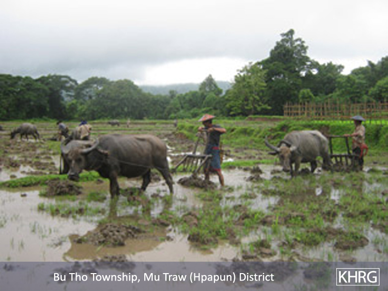 This report includes a situation update submitted to KHRG in April 2012 by a community member trained by KHRG describing events occurring in Bu Tho Township, Papun District, prior to April 2012. It contains updated information concerning an increase in Tatmadaw and Border Guard military activity since the January 2012 ceasefire agreement with the KNU, including more frequent transportation of rations, building materials and weapons, and an increase in troop deployment. It describes how Tatmadaw LIB #341, #434, #340, and #642 have established permanent bases by the Papun vehicle road, and how troops reportedly remain stationed at numerous bases along the Thailand-Burma border. Land confiscation for infrastructure projects and the construction of military bases and plantations is highlighted as a significant issue, and continued natural resource extraction also serves to limit the amount of cultivatable land available. State-led development projects at the village level are also cited as contributing to land confiscation as a result of demands for land from government officials involved. Information is also provided on the construction of a new village in Meh Pree Township by a monk in command of approximately 20-30 soldiers. Villagers continue to face demands for food and goods, such as thatch shingles, and demands for forced labour. Significantly, demands for money, or for villagers to serve as soldiers and guides or to perform sentry duty, has reportedly ceased, and there has been a reduction in travel restrictions since January 2012. Some limited landmine clearance is reported to have occurred after villagers discussed the problem with a Tatmadaw officer. Other villagers have adapted to the reduction of suitable farmland by trading livestock and transporting food to sell. Villagers also refused to comply with demands for land in exchange for electricity, and confronted officials over the issue.