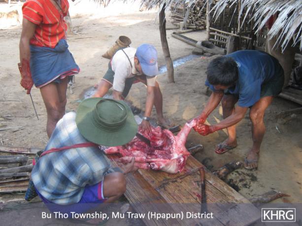 These photos, taken on February 11th 2012, show C--- villagers preparing one goat, left, and one pig, right, for Burma government members from Papun District when they visited to set up a hydroelectric energy source in C--- village, Papun District. [Photos: KHRG]