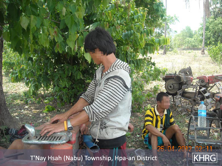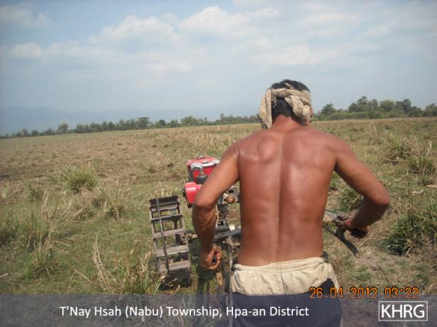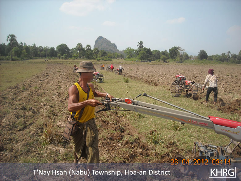 According to a local village head, during April 2012, Tatmadaw soldiers from Light Infantry Battalions (LIBs) #547, #548, and #549 ordered residents of Htee Hpoh Kyaw, Mya P'Deh and Noh Ta Pweh village tracts in T'Nay Hsah Township to bring 12 hand tractors from each village tract in order to plough a paddy field owned by the Tatmadaw.[4] The villagers from Htee Hpoh Kyaw village tract brought 12 hand tractors, the villagers from Mya P'Deh village tract came with nine tractors, while, the villagers from Noh Ta Pweh village tract came with only two hand tractors, making the task of ploughing the paddy field difficult.