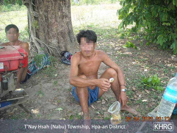 These photos, taken in April 2012, show local villagers resting while ploughing a flat field for Tatmadaw troops. The villagers were not provided with any food whilst carrying out the work, and had to bring their own supplies every day until they had completed ploughing the ten acres of land that each village tract was tasked with. [Photos: KHRG]