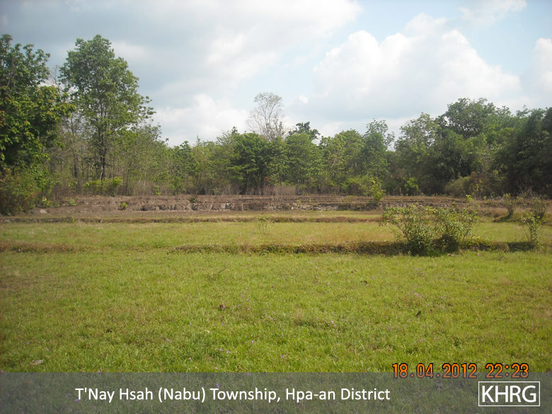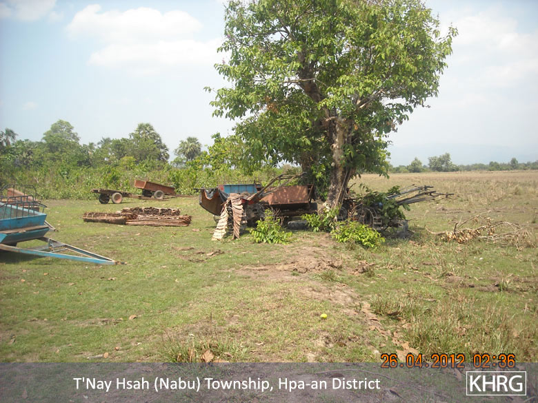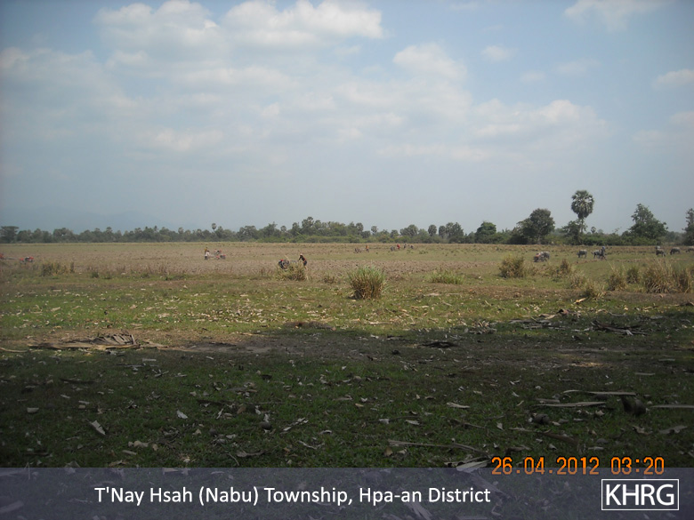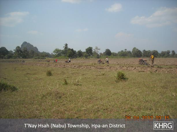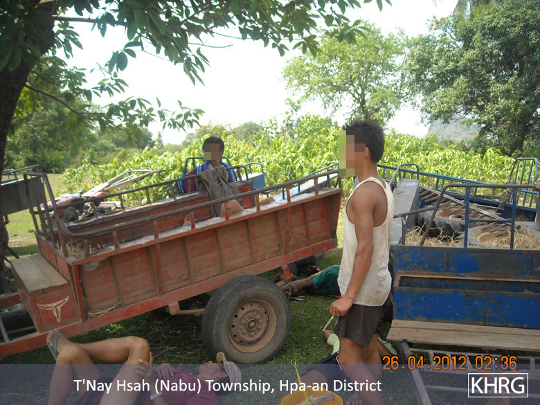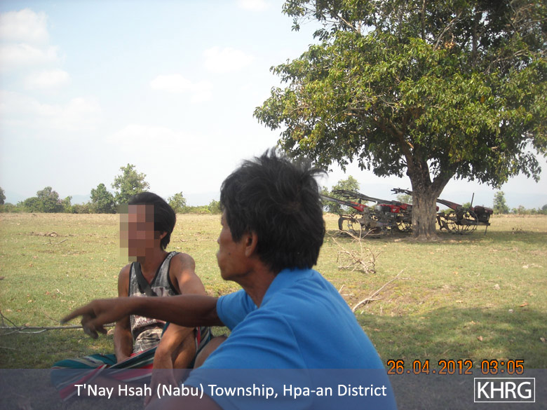 When the villagers who go and gamble, use Yaba and drink, they pawn their farms and cows. Battalion Commander Mya Hkaing invaded about 20 farms in the area including other properties as well. Many villagers became poor because of this. Mya Hkaing ordered the villagers to do Loh Ah Pay in which they ploughed, harrowed, sowed, and harvested rice, until the rice arrived at the rice store. This year, after the villagers worked for the Burmese [Tatmadaw], they had to work for the Border Guard. The villagers who were not free to go had to hire a person to work instead of them. They have to pay 4,000 Kyat (US $4.76) for ploughing, 4,000 Kyat for harrowing and 3,000 Kyat (US $3.57) for harvesting per day. Therefore, I see that this oppresses the villagers. The government gave the Border Guard a place to build their camp. They got rid of the villagers and built their camps. The Border Guard built their camps in 2011. One camp required 500 acres [of land]. This land was the villagers', but the villagers did not get any compensation.