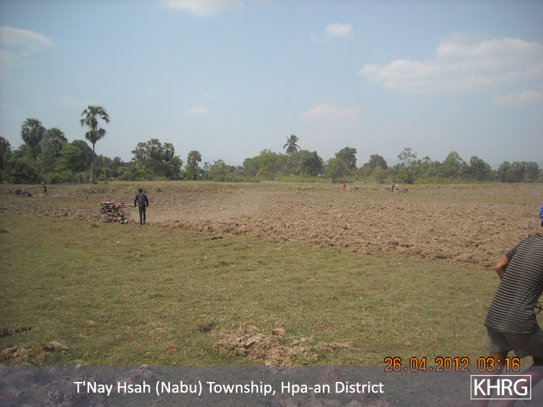 The above photos were taken on April 22nd 2012 in T’ Nay Hsah Township, Pa’an District. These photos show villagers ploughing paddy fields for the Tatmadaw. Villagers from three village tracts are shown in the photos, including Htee Hpoh Kyaw, Mya P’Deh and Noh Ta Pweh. Each village tract had to provide 12 hand tractors. However, villagers from Mya P’Deh village tract brought nine hand tractors and villagers from Noh Ta Pweh brought two hand tractors. The villagers who ploughed the fields for the Tatmadaw had to bring their own food and other necessary materials.[Photos: KHRG]