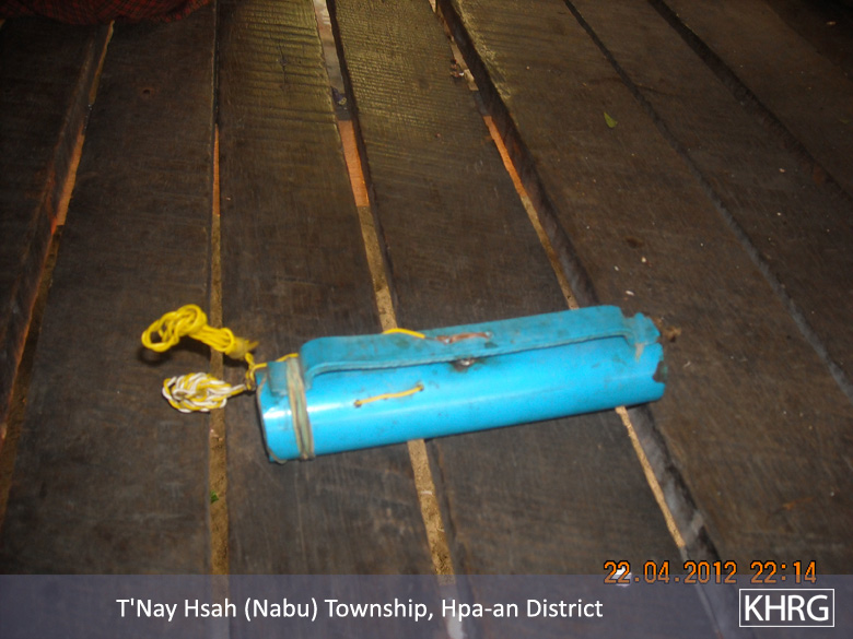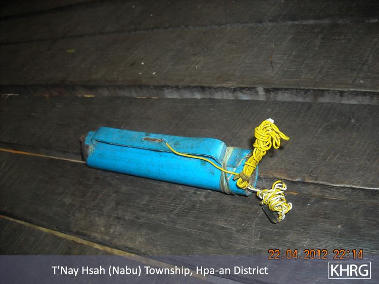 The photos were taken on April 22nd 2012 in T’ Nay Hsah Township, Pa’an District, and show a Border Guard landmine like those that have killed villagers and hit villagers’ animals, such as cows, buffalos and goats. This landmine was made using a plastic pipe and is reported to be about one locally-defined ‘hand span’ (22.86 cm. / 9 in.) in length. The landmine is filled with one and a half tins of milk worth of gunpowder, and pieces of iron and nails, and ten sealed on both sided with a locally-produced glue. The firing mechanism is created on the pipe by drilling a hole and attaching a detonator. In order to create a firing mechanism on the pipe, a hole is drilled and a detonator is attached. When it is planted, it is also covered with two layers of plastic bags, and after a landmine such as this one has been planted, it can be said to be operational for one, two, or even up to three years; thus, villagers remained concerned about the landmines they are aware of throughout this period.[Photos: KHRG]