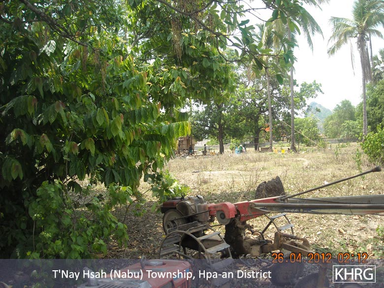 The villagers have to do forced labour every day. The forced labour is ordered by the Government army [Tatmadaw], which stays in L--- village. They are LIB #547, LIB #548 and LIB #549. Twenty years ago, in L--- village, most of the population was Muslim and there were also villagers who were Pwo Karen and Sgaw Karen. When the government army arrived and set up their camp, they got rid of all the Muslim and Karen [villagers]. They invaded all the farms, the plantations, and the villagers' land. They turned farms that they invaded into a so yah naing myin [government appropriated land]. On April 26th 2012, I went and took photos of their camp located in L--- village, and [photos] of where the government got rid of the villagers, and where the villagers now have to go and do loh ah pay[5] such as ploughing the confiscated farms.