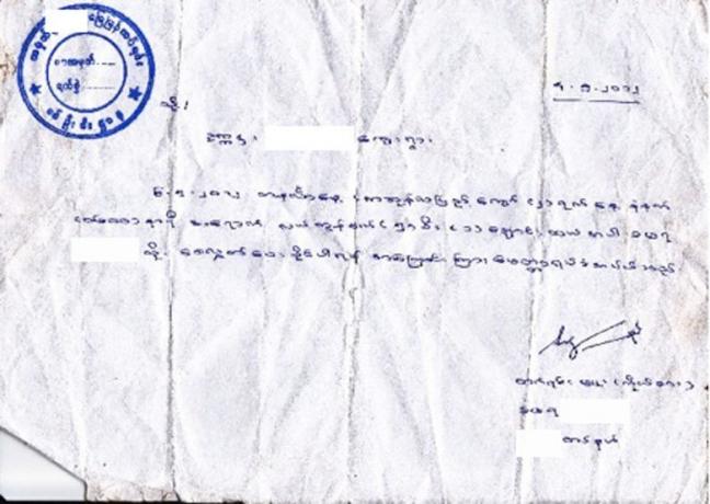 This photo shows an original order letter sent to the head of O--- village on May 4th 2012 by Tatmadaw LIB #--- Battalion Commander from S--- Military Camp in Pa'an District. The letter instructs the village head to send five tractors to LIB #--- on May 6th 2012. The KHRG researcher who collected this order letter and spoke with the local village tract leader reported that villagers in the area are ordered annually to provide agricultural equipment and labour to cultivate rice fields belonging to Tatmadaw soldiers without compensation. A translated copy of this order is available as Order #3 in this report. [Photo: KHRG] |