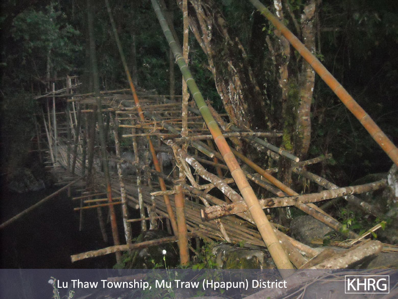 The photo on the left was taken by a community member trained by KHRG on September 6th 2012, and shows a bridge constructed by Tatmadaw soldiers across the K’ Hploh Loh river in the Ta Hkeh Der area, Hkay Poo village tract. The photo on the right is of the K’ Hploh Hta Bridge, which is located on the Pgoh Loh River. Both bridges were built by theTatmadaw andused for travelling and transporting rations, but civilians are able to use both levels of the two-story bridges. [Photos:KHRG]