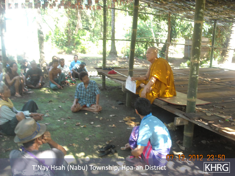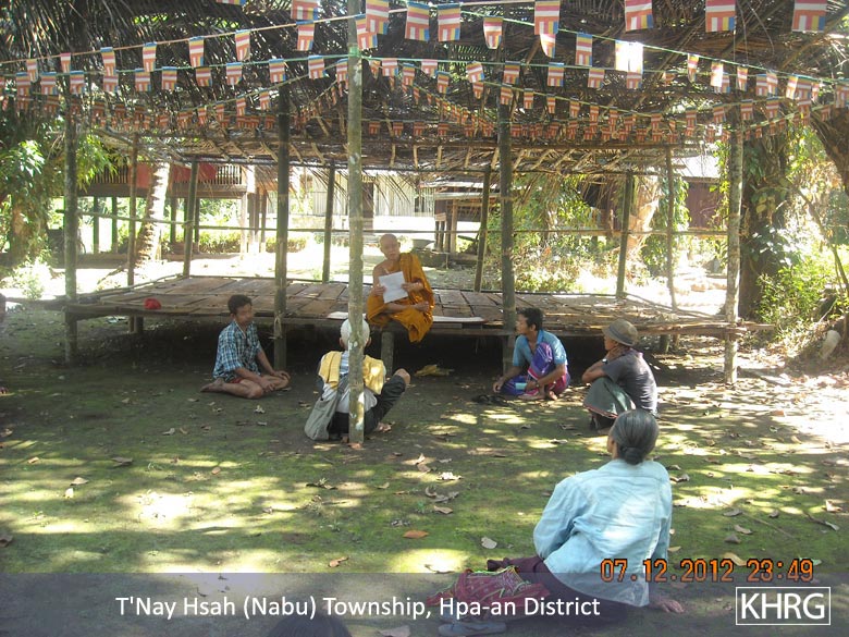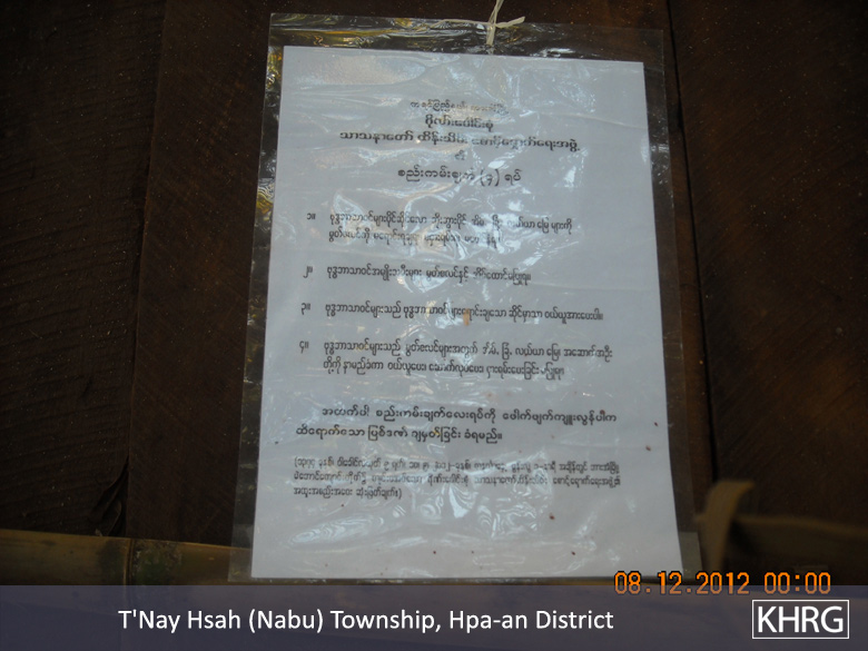 This report includes a situation update submitted to KHRG in December 2012 by a community member describing events occurring in Hpa-an District, including a meeting that took place on December 7th 2012 on the grounds of the M--- village monastery in Noh Kay village tract, T'Nay Hsah Township. During this meeting, attended by 41 villagers from P---, A---, W--- and M--- villages, a monk presented a document with four rules regulating relations between Buddhist and Muslim villagers, which prohibit Buddhists from selling land to Muslims, prohibit Buddhist women from marrying Muslims and require Buddhists to buy goods from Buddhist shops only. Furthermore, the document states that those who do not follow the rules will be "punished effectively"; a photo of the document is included below. Information in this report suggests that the events described are seen by villagers as connected to events in Rakhine State, given the dissemination of a CD containing footage from Rakhine State amongst local villages prior to the rules being released. Further, the community member suggests that such meetings have taken place in other villages and townships, and that the relationship between Buddhist and Muslim villagers has deteriorated, with a reduction in trade and communication between the groups. A different KHRG community member also described the dissemination of similar documents by a monastery to Border Guard Force soldiers and local monks in K'Ter Tee village, Papun District; see "Papun Situation Update: Bu Tho and Dwe Lo Townships, September to December 2012," KHRG, March 2013.