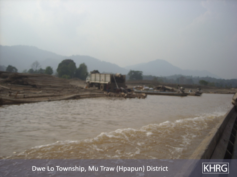 The gold mining in Dwe Lo Township has been carried out since 2006 and, until now, it has damaged a lot of lands, trees, bamboo, natural resources, the source of the river and civilians' lands. Because the gold mining was carried out, the civilians have had to deal with [problems] such as damaged properties and, moreover, the polluted water that contains chemicals coming from the gold mining[11] flowing in the river, so [that] when the civilians drink [water] it causes sickness. Moreover, there were many cattle, buffalos and fish that got sick after they drank water and [as a result] they are dead. The gold mining started in Baw Paw River. The civilians from the town came and asked permission from headquarter [KNU] department Baw Lah, and Baw Lah gave them permission and they could do it. At that time, there was no truck [bulldozer] that was used in the gold mining.