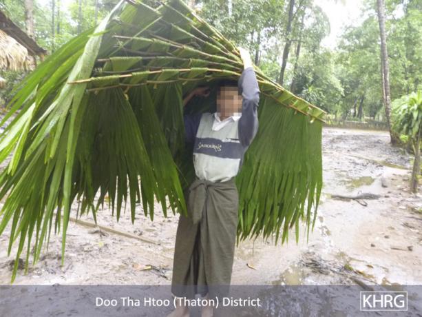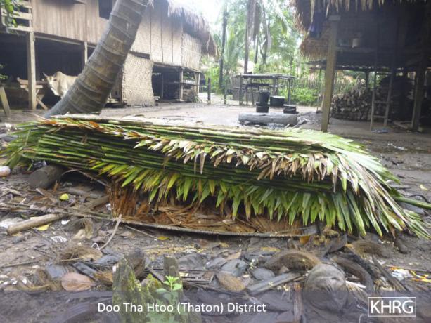 Tatmadaw soldiers again ordered villagers from D--- village to provide thatches for barracks repair at Lay Kay army camp during a period of heavy rain in September 2012.