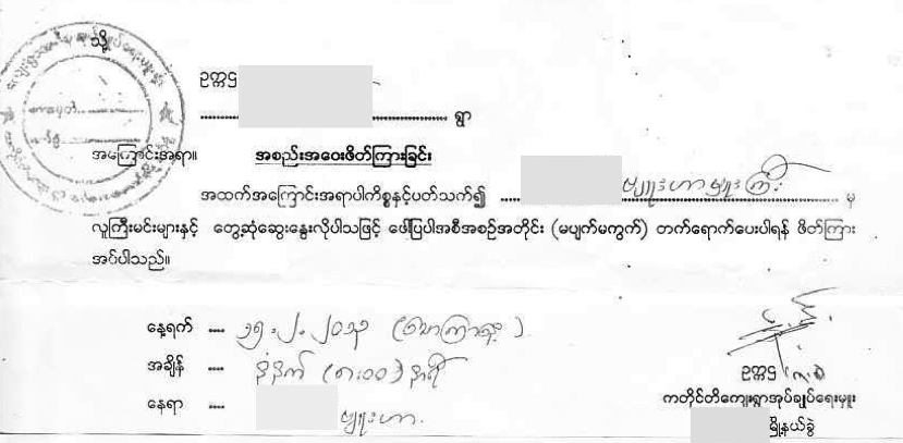 Order letters from all groups included here were either hand-written or typed, and were often certified by an official stamp. As well as the order letters issued for meeting attendance, this report also contains order letters issued by military or civilian government authorities demanding that villagers provide bamboo or thatch for military camp maintenance (Order #4); perform labour for infrastructure development (Orders #3, #23, #24, #25); complete the registration and distribution of land use permits (Order #1); attend a meeting about village development or security (Order #5); and pay an arbitrary tax (Order #6, #12, #13, #15).