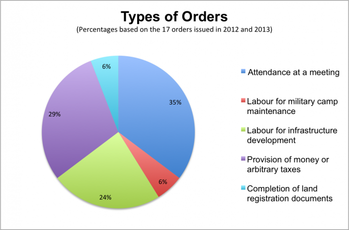 While most order letters written in 2012 and 2013 do not contain explicit threats of reprisal, some orders included in this report do state that villagers or village heads must attend meetings ‘without fail’ (Orders #7, #14) or ‘without absence’ (Orders #2, #10, #23). Such orders carry an implicit threat when written by authorities with a history of perpetrating abuse.