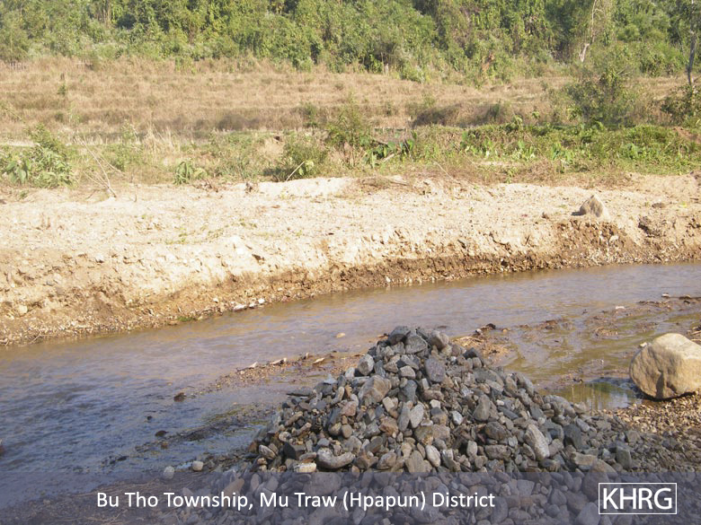 The above photos were taken on January 7th 2013. The above left photo was taken in Meh Klaw village tract on the Meh Tee Loh River, and it shows piles of stones and people, such as the man carrying stones on his shoulder in the photo on the left, who collect stones for their livelihood. The right photo shows the river where the stone has been collected from in Klaw Day village. The village head observes the process and said that this stone trading can destroy villagers’ flat field farms, as the water level of Meh Tee Loh River will rise during monsoon season and nearby farms will be flooded without large stones to reinforce the sides of the river. [Photos: KHRG]