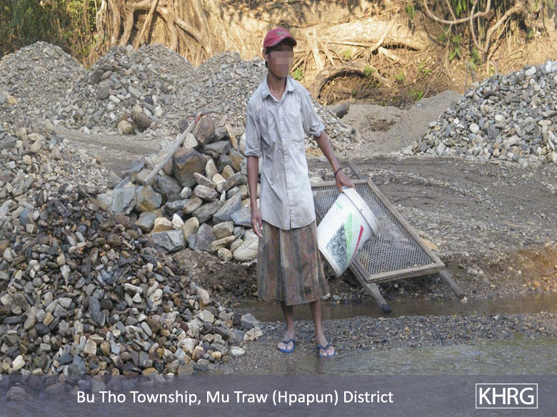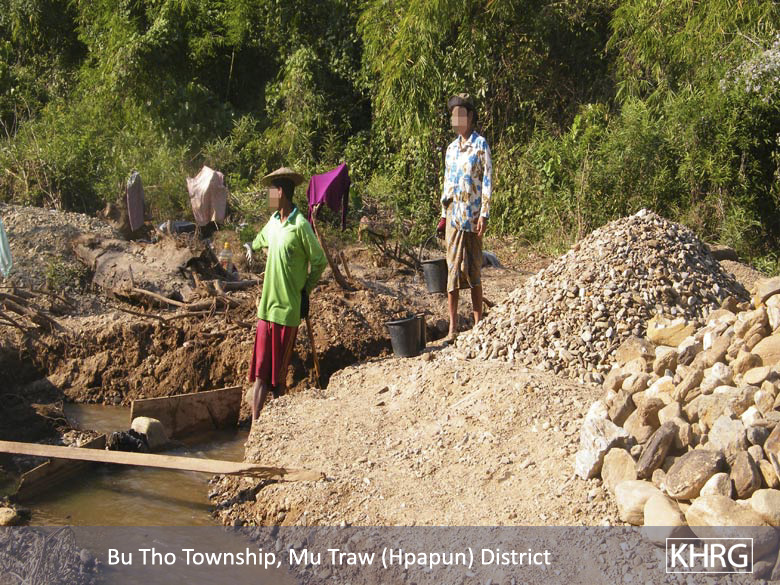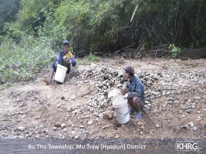The above photos were taken on January 7th 2013, and show villagers collecting stones in Meh Tee Loh River beside a flat field in order to sell the stones. As they do not have jobs or any steady income, they collet stones for money. These people are not residents of Meh Klaw village tract, but they are from Ta Kon Taing, Way Muh, Way Hsa, Meh T’Roh and T’Poh Klah villages. Some of them are Tatmadaw soldiers’ family members. [Photos: KHRG]