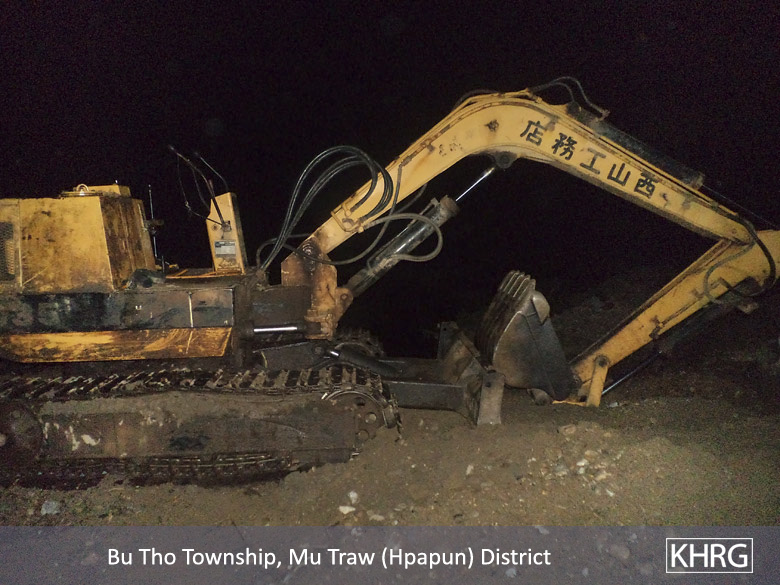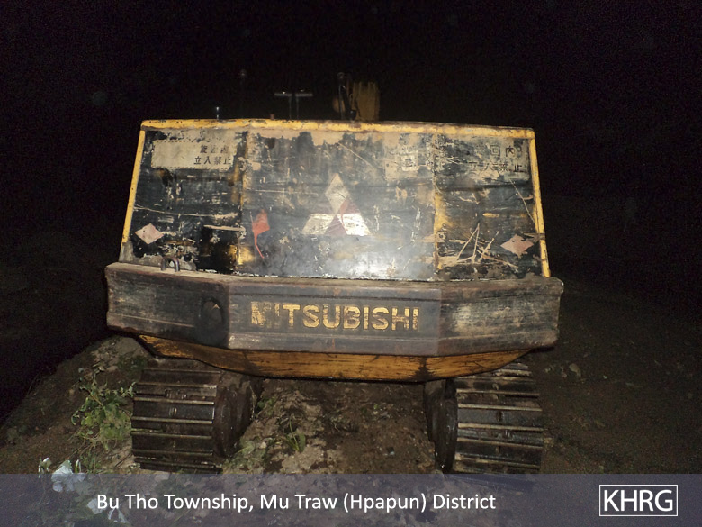 The above photos were taken on January 1st 2013, and they show two different angles of a Mitsubishi bulldozer beside the Meh Tee Loh River, near the Ta Kon Taing village flat field farm in Bu Tho Township, Hpapun District. According to the community member who took these photos, the bulldozer is operated by a Burma government construction company, referred to locally as “GE”, and is used for repairing the Way Hsa Way Moo vehicle road, repairing Tatmadaw army camps and for constructing additional buildings in Meh Klaw village tract. In order to do such construction, the company takes stone and sand from Meh Tee Loh River beside Peh Klaw Day villagers’ farms. They started collecting materials in October 2012. According to the community member, the local KNU authority, village head and village tract leader gave the company permission to collect stones and sand for only ten days in October 2012; however, as of January 2013, they are still collecting stones.[3] [Photos: KHRG]