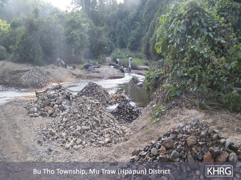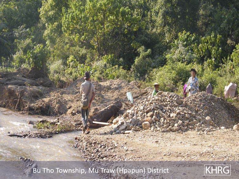 The above left photo was taken on January 8th 2013 in Ta Kon Taing village, Meh Klaw village tract, and shows a person who is blind, but collecting stones like other people for his income. The above right photo was taken on January 7th 2013, and it shows villagers who are collecting stones at Meh Tee Loh River, Meh Klaw village tract for their livelihood, which they sell to a Burma government construction company. According to the community member who took these photos, they work for the whole day but only earn 5,000 kyat (US $5.08) per person per day. Collecting stone may destroy Klaw Day villagers’ flat farms and canals, so villagers from Klaw Day are opposed to ongoing stone mining. [Photos: KHRG]