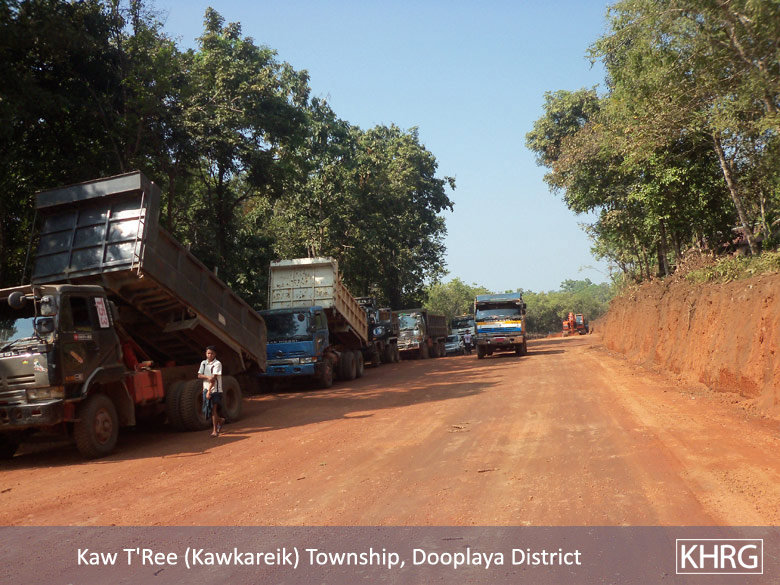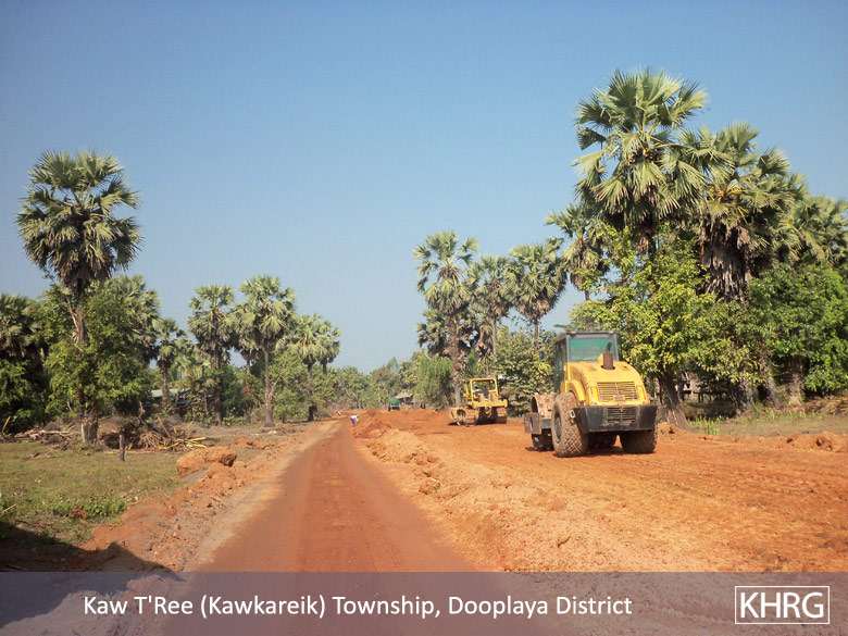 Because the KNU has signed the preliminary ceasefire with the Burmese government, for the development of the region the KNU allowed the government to construct and repair bridges and three concrete vehicle roads in Brigade #6, Dooplaya District, between Than Phyu Za Yap and Hpa Ya Thone Su, Kyainseikgyi and Kyeh Don, and Kawkareik via A’ Zinn to Paing K’ Ler and Taung Ka Lay. When the companies came and worked on the three roads, they widened the narrow parts of the roads and straightened the curved roads [constructed new sections of road to cut across particularly curved sections of the existing road in order to shorten it]. As a result, the farms and plantations of some villagers were destroyed. Some of the owners of the land that was destroyed said that they would be very happy if they received proper compensation.