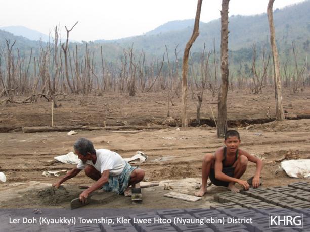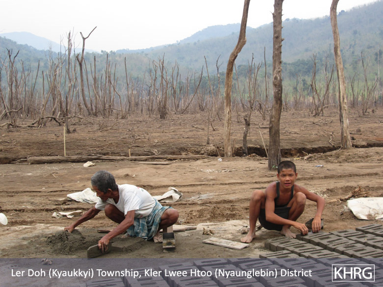 This photo shows a father and his son making cement blocks for their livelihoods. He [the father] sends his son to school [by making money from cement blocks]. [Photo:KHRG]