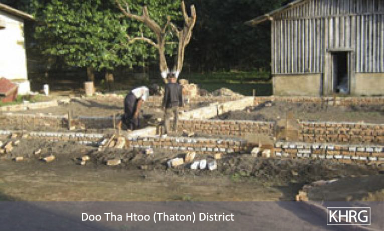 According to information from KHRG researchers between February and August 2013, forced labour remained ongoing in Thaton District. The most commonly reported perpetrators were Tatmadaw LIB #561 and BGF Battalion #1014. However, forced labour demands had stopped in six villages in Bilin Township.