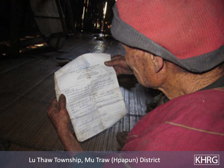 The following Interview was conducted by a community member trained by KHRG to monitor local human rights conditions. It was conducted in Hpapun District in January 2014 and is presented below translated exactly as it was received, save for minor edits for clarity and security.[1] This interview was received in January 2014 along with other information from Hpapun District, including seven other interviews, six incident reports, one situation update, three videos clips and 86 photographs.[2]