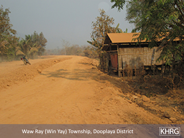 [17] Due to the location of Saw A---’s village and details of the road being constructed provided in the interview, KHRG was able to determine that the road in question is the Asian Highway. The Asian Highway Network is a United Nations Economic and Social Council for Asia and the Pacific-supported project that aims to link 32 countries in Asia across 141,000 kilometres of roadway. In Burma/Myanmar the project has involved land confiscation and forced labour. For more information about the Asian Highway Network, see “The Asia Highway: Planned Eindu to Kawkareik Town road construction threatens villagers’ livelihoods,” KHRG, March 2015; “‘With only our voices, what can we do?’: Land confiscation and local response in southeast Myanmar,” KHRG, June 2015; “Tollgates upon tollgates: En route with extortion along the Asian Highway,” KHRG, October 2009; and “Development by Decree: The politics of poverty and control in Karen State,” KHRG, April 2007. In addition, fighting continues erupting between the Tatmadaw and the DKBA along the highway, with the latest clash erupting in early July 2015, resulting in the highway between Myawaddy and Kawkareik shutting down for several days, see more at: “Recent fighting between Tatmadaw and DKBA soldiers leads to killing and displacement of villagers in Hpa-an District, July 2015,” KHRG, August 2015. See more on land confiscation and environmental destruction as result of the Asian Highway road construction in Win Yay Township at: “Dooplaya Photo Set: Road construction in Kyainseikgyi and Win Yay townships, November 2014 to January 2015,” KHRG, August 2015.