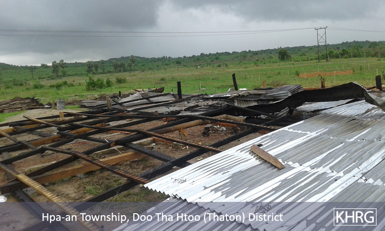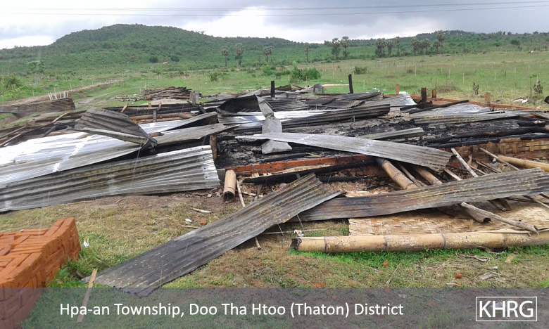 This News Bulletin describes an incident in which the Burma/Myanmar government police force and Burma/Myanmar Department of Forest Management destroyed and burnt down 97 villager houses, displacing approximately 500 villagers in B--- village, Hpa-an Township, Thaton District in June 2015. Despite holding Karen National Union (KNU) issued land grants, villagers were ordered by the Burma/Myanmar government to move out of their village since the government demarcated the area as a forest reserve. However, villagers reported that this land was the location of their old village, which they had to leave behind in 1983 during altercations between the Tatmadaw and the Karen National Liberation Army (KNLA). The villagers also noted that even though the government demarcated the land as a forest reserve, there are no big teak or ironwood trees there. In addition, businessmen from Hpa-an Town came and planted rubber trees and the Tatmadaw sometimes use the area for target practice. The Chief Minister of Kayin State, U Zaw Min, threatened villagers into signing a document stating they agree to dismantle their houses and would not live on that land anymore. In attempting to prevent the destruction of their village, villagers sought help from Saw P---, who attempted to advocate on their behalf, to no avail. When the villagers refused to dismantle their village, the Burma/Myanmar government police arrested 25 villagers, one monk and one KNU/KNLA-Peace Council (KNU/KNLA-PC) member and continued to raid the village, burning and looting villagers’ houses, and planting teak trees. In the aftermath of the raid, approximately 100 villagers fled to Myawaddy with the help of Saw P---, since they do not dare to live in the village any longer. A KHRG researcher also interviewed one of the fleeing villagers and a full interview can be found here.[1]