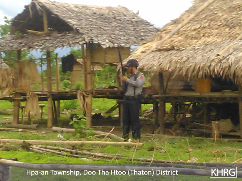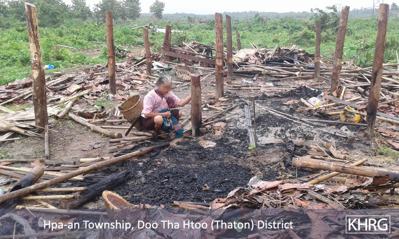 On July 5th and 6th 2015, members of Karen Human Rights Group (KHRG), Karen Environmental and Social Action Network (KESAN) and Karen Women Organisation (KWO) met with the villagers from B--- village, Hpa-an Township, Thaton District whose houses were destroyed and burnt down by the Burma/Myanmar government police force from Myaing Ka Lay Town between June 22nd and June 25th 2015. The villagers recounted in detail how the incident unfolded and the strategies they used.