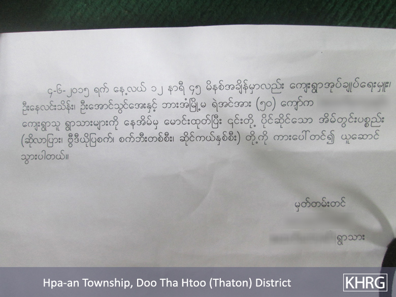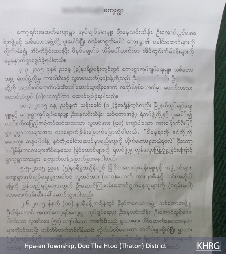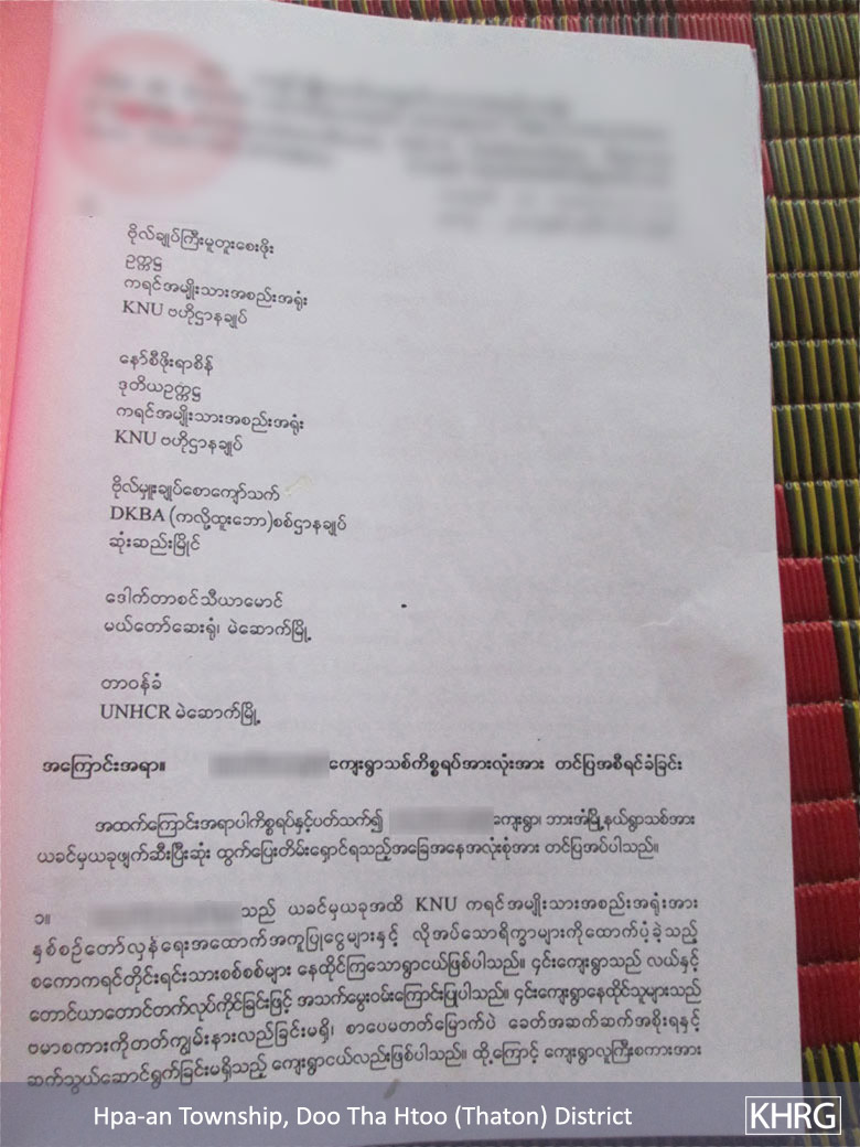 These photos were taken by a KHRG member on July 6th 2015, in B--- village, Kaw Yin A Htet village tract, Hpa-an Township, Thaton District. The photos show a complaint letter that was written by B--- villagers and Saw P--- and submitted to the KNU, Democratic Karen Benevolent Army (DKBA), Mae Tao Clinic and UNCHR-Mae Sot office. The complaint letter is regarding the hardship that the B--- villagers suffered as a result of the Burma/Myanmar government police force and Department of Forest Management destroying their houses, which resulted in their forced relocation. They submitted this complaint letter to the above organisations in hopes that they will help them get their land back and pressure the Burma/Myanmar government to release their fellow villagers that they arrested and continue to detain in Hpa-an and Taung Ka Lay jails. [Photos: KHRG]
