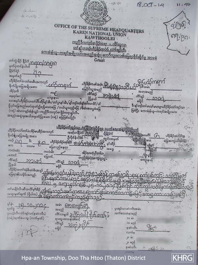These photos were taken by a KHRG member on July 6th 2015. The first photo shows a land grant that was provided by the KNU to the B--- villagers on October 18th 2014. The second photo shows a complaint letter that B--- villagers submitted after their houses were destroyed and burnt down by the Burma/Myanmar government police and officials from the Department of Forest Management. This particular letter was submitted to the KNU liaison office in Hpa-an Town. [Photos: KHRG]
