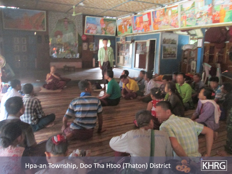 These photos were taken by a KHRG member on July 6th 2015. The first photo was taken in C--- village, Kaw Yin A Htet village tract, Hpa-an Township, Thaton District and the second photo was taken in Myawaddy, Kawkareik Township, Dooplaya District. The first photo shows more than 40 B--- villagers meeting with KNU delegates at C--- monastery about the incident that happened between June 22nd and 25th 2015, when their village was burnt down by the Burma/Myanmar police force and officials from the Burma/Myanmar Department of Forest Management. The second photo depicts B--- villagers who fled to Myawaddy meeting with KNU representatives in S--- monastery in Myawaddy. More than 40 villagers also came to the meeting to discuss the same incident. In both meetings, villagers demanded that, “The Burma/Myanmar government release those who are in the Hpa-an and Taung Ka Lay jails; The government allow the people who fled to Myawaddy to come back freely, without arresting any of them, as well as pay the villagers for the things that they had destroyed and stolen; and that the KNU help villagers get back their land.” [Photos: KHRG]