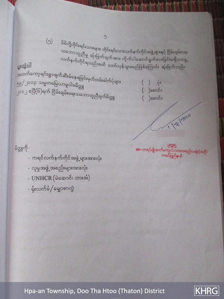 In January 2015, villagers went back to the area and started to build houses and live in the area. On February 1st 2015, U Zaw Min, the chief minister of Kayin State, summoned 15 of these villagers to his office and ordered them to sign an agreement stating that the villagers will dismantle the houses by June 22nd 2015 and will not live on that land anymore. According to the villagers who were summoned by U Zaw Min, “He looked very aggressive and he punched the table repeatedly when he was speaking.” The villagers told a KHRG member that they did not want to sign the agreement, but U Zaw Min threatened to put the villagers in jail, therefore they had no choice but to sign the document.