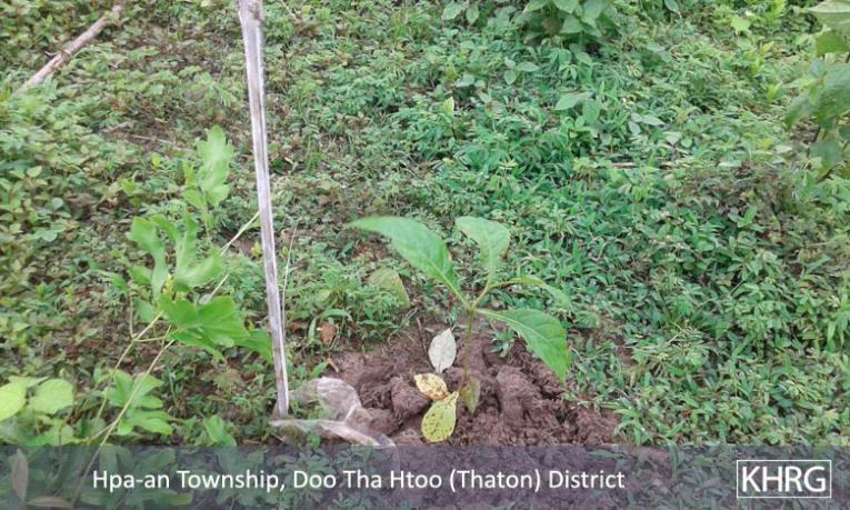 These photos were taken by a B--- villager on June 26th 2015, in B--- village, Kaw Yin A Htet village tract, Hpa-an Township, Thaton District. The photos show young teak trees, which were planted by the officials from the Burma/Myanmar Department of Forest Management when they destroyed and burnt down villagers’ houses between June 22nd and June 25th 2015. [Photos: B--- villager]