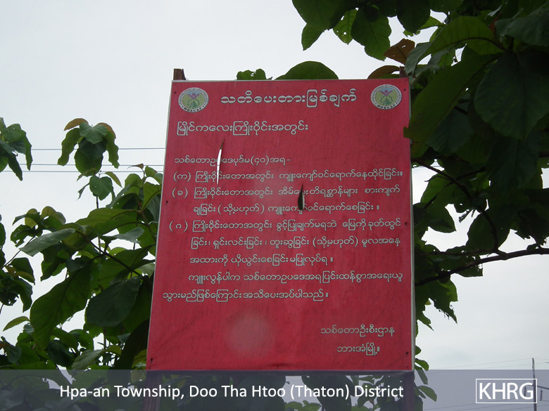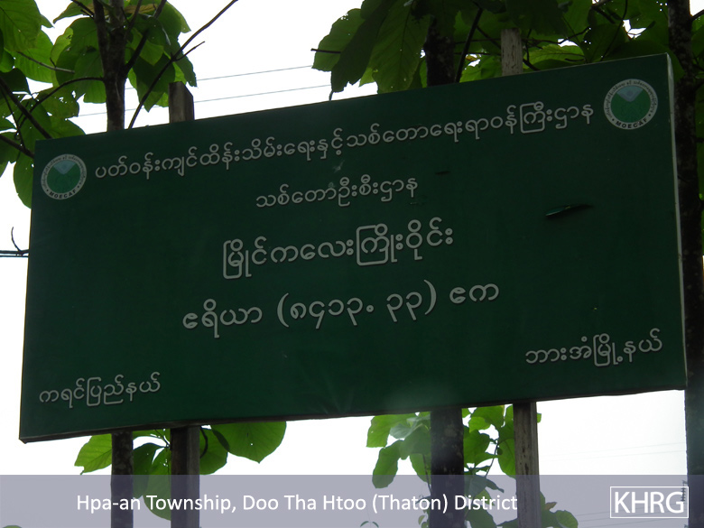 These photos were taken on July 6th 2015, in B--- village, Kaw Yin A Htet village tract, Hpa-an Township, Thaton District. The photos show signboards put up by the Burma/Myanmar Department of Forest Management in the Myaing Ka Lay Forest Reserve. The first signboard reads, “Ministry of Environmental Conservation and Forestry, Department of Forest Management, Myaing Ka Lay Forest Reserve area, 8,413.33 acres, Kayin State, Hpa-an Township.” The second signboard reads, “Warning of prohibited [activities in] Myaing Ka Lay Forest Reserve. According to the Forest Law article #40: (a) Trespassing and living on the forest reserve, (b) Grazing or trespassing livestock on the forest reserve and (c) Cutting down trees, clearing the land, digging the soil or destroying any natural features of the land is prohibited. Trespassing on the forest reserve will be prosecuted to the full extent of the Forest Law. Department of Forest Management, Hpa-an Town.” [Photos: KHRG]
