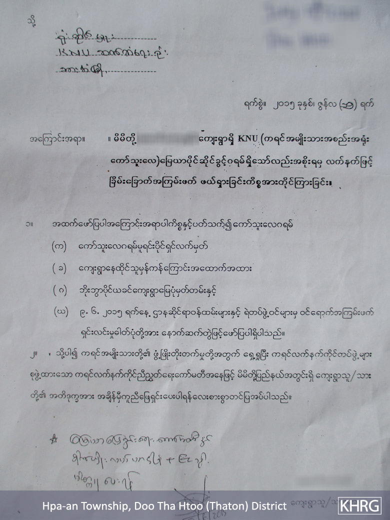 These photos were taken by a KHRG member on July 6th 2015. The first photo shows a land grant that was provided by the KNU to the B--- villagers on October 18th 2014. The second photo shows a complaint letter that B--- villagers submitted after their houses were destroyed and burnt down by the Burma/Myanmar government police and officials from the Department of Forest Management. This particular letter was submitted to the KNU liaison office in Hpa-an Town. [Photos: KHRG]