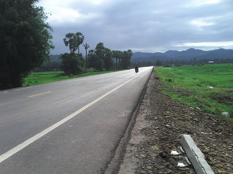 These photos were taken by a KHRG community member on July 22nd 2015, between Myawaddy and Kawkareik Town, Kawkareik Township, Dooplaya District and show a section of the Asian Highway. An opening ceremony for the highway was planned by the Thai and Burma/Myanmar governments, scheduled to take place on July 20th 2015, but the plans were cancelled due to the fighting that took place between the DKBA and Tatmadaw soldiers. The fighting erupted after Tatmadaw soldiers tried to take control of the highway ahead of the planned ceremony. [Photos: KHRG]