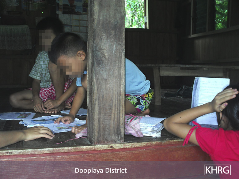 These photos were taken by a KHRG community member on July 20th 2015, in J--- village, Kawkareik Township, Dooplaya District. The photos shows the J--- village primary school and students after the school reopened when fighting between the DKBA and Tatmadaw soldiers ceased. The school was closed for two days, on July 15th and July 16th 2015, because of the fighting. According to J--- villagers, DKBA soldiers slept in the school one night during the fighting and on another night Tatmadaw soldiers from Light Infantry Battalion (LIB) #230 led by Battalion Commander Aung Naing Thu slept in this school. [Photos: KHRG]