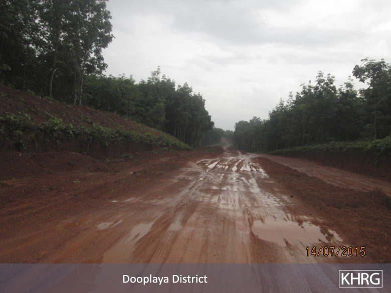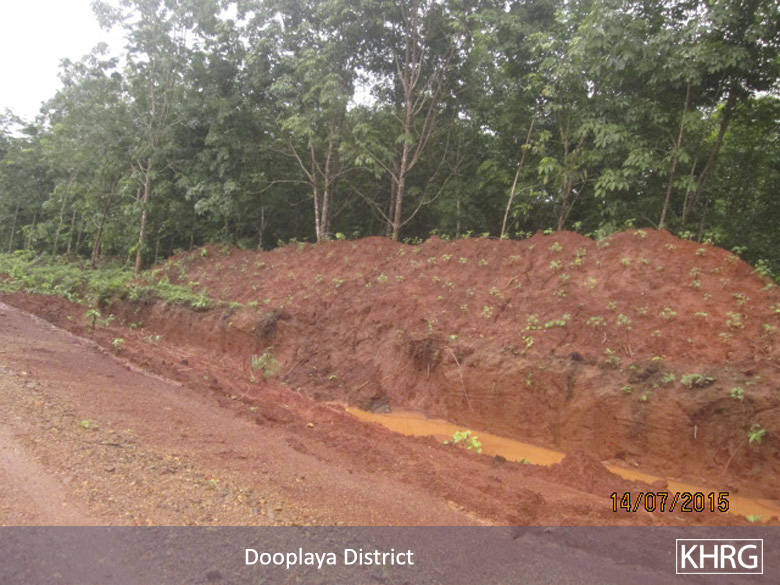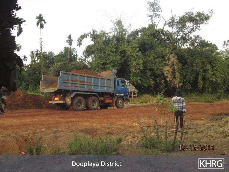 This Photo Set illustrates road construction and expansion taking place in Kyainseikgyi and Kyonedoe townships, Dooplaya District between December 2014 and July 2015. These projects, managed by Khin Zaw Company, as well as another unknown company that has been subcontracted by the Burma/Myanmar government, destroyed villagers’ betel nut and rubber plantations. The affected villagers have not yet received any compensation for their losses.