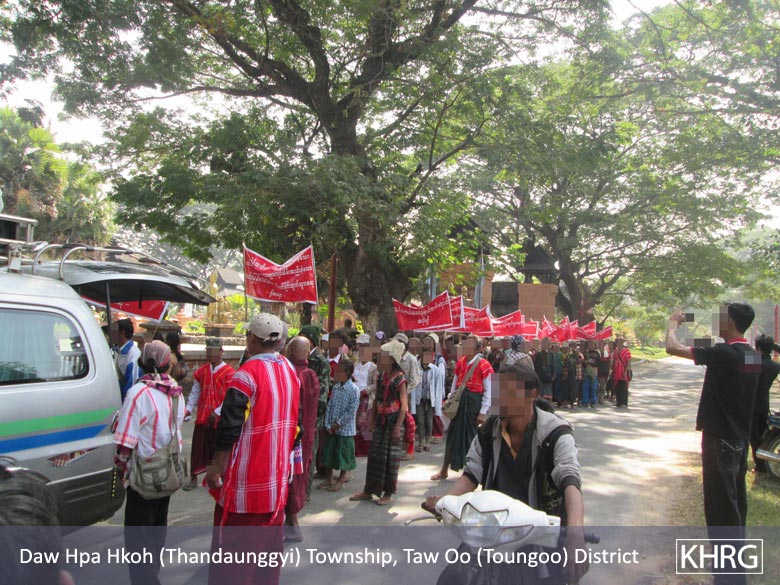 The above photos were taken on January 12th 2016 in Toungoo Town, Thandaunggyi Township, Toungoo District, show villagers from two village tracts gathering together on the road in Toungoo Town to hold a land demonstration. It was the second time they held a protest against Kaung Myanmar Aung Company to get their land back. [Photos: KHRG]