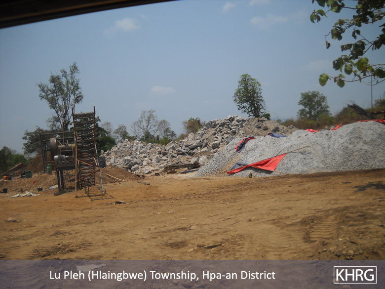 These photos were taken by a KHRG community member in April 2016, in Lu Pleh [Hlaingbwe] Township, Hpa-an District. The photos show a vehicle road being constructed from Lu Pleh [Hlaingbwe] Town to Klaw K’Tee [Shan Ywa Thit] Town, and piles of stones that are being used for the road construction. [Photos: KHRG]