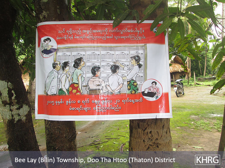 • Regarding the 2015 general election, local villagers across Thaton District complained of disappointment about representative parties for not holding proper education in their constituency during the campaign period. Villagers did not understand how to vote and where to vote. In addition, local people who did not have an ID card were not allow to vote but also some people who were eligible to vote were excluded from the voting list.