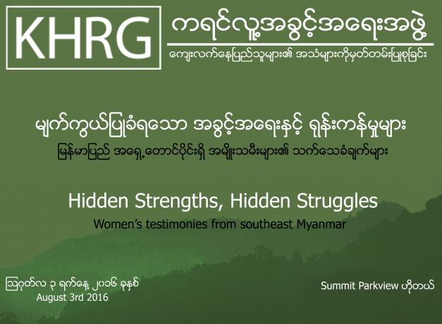 Today, at Summit Parkview Hotel in Yangon, Karen Human Rights Group (KHRG) launched its thematic report entitled Hidden Strengths, Hidden Struggles: Women’s testimonies from southeast Myanmar which projects the voices of local women from southeast Myanmar and aims to present a comprehensive picture of their changing roles and experiences in this time of ceasefire and democratic change. The report comes ten years after KHRG published Dignity in the Shadow of Oppression, a report highlighting the abuse and agency of women in a highly militarised context during the conflict period. Hidden Strengths, Hidden Struggles highlights issues such as gender-based violence, militarisation, land confiscation, access to healthcare and education, and how continued human rights abuses in southeast Myanmar affect women and men differently, an aspect often overlooked. In addition, it highlights the agency strategies that women employ for self-protection and the challenges women in southeast Myanmar face when attempting to access justice for abuses.