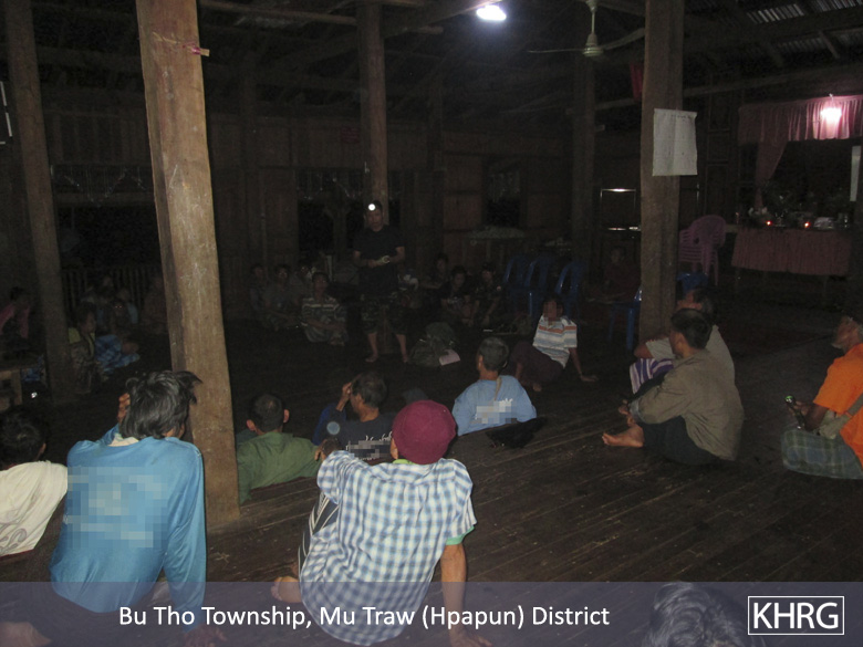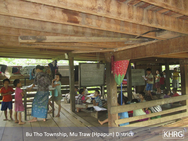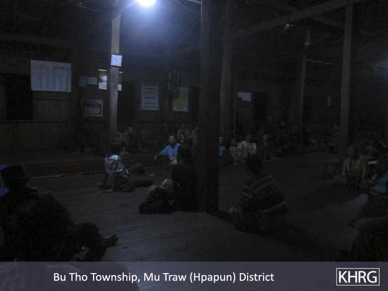 This Photo Set shows the consequence of the Karen National Liberation Army (KNLA)’s recruitment incident that occurred in Bu Tho Township, Hpapun District in between August and October 2015. Many of the villagers in Kyaw Pah village tract fled to Myaing Gyi Ngu Town to evade the KNLA’s recruitment. Due to the lack of information, it led them to flee their village and leave their properties, work places and livestock. Schools were closed so children could not access their education. The Photo Set also describes how the KNLA’s Company #4 Company Commander held a consultation meeting with villagers explaining the detailed information on the recruitment and promising to stop the recruitment activity to prevent villagers from fleeing their village. However, many villagers still chose to resettle to Myaing Gyi Ngu Town.