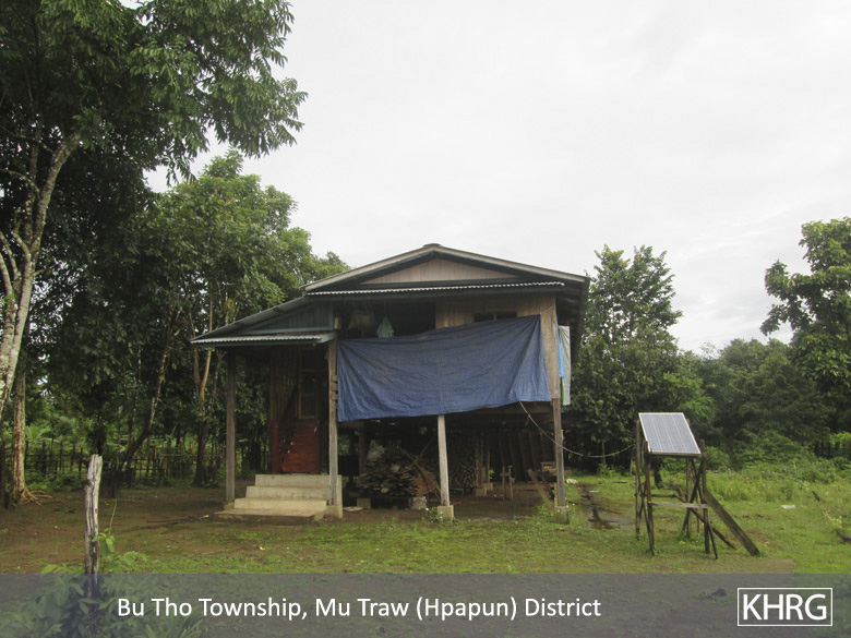 These two photos were taken by a KHRG community member on October 11th 2015 in Kyaw Pah village tract, Bu Tho Township, Hpapun District. These photos show G--- villagers’ houses. Villagers left their houses and fled to Myaing Gyi Ngu Town. The reason why they left their houses and fled is because they heard a rumour that the KNLA’s soldiers would come and recruit soldiers in their village so they were afraid. Some of them do not want their sons to serve as soldiers, therefore they fled to Myaing Gyi Ngu Town. Some of them they did not know the situation and they thought and worried that the reason that KNLA was recruiting more soldiers was because the fighting would resume again. So, they were afraid and they fled to Myaing Gyi Ngu Town. Other reasons were: they worried that the Tatmadaw soldiers would operate in their area again; that Border Guard Force (BGF) soldiers would come to their village; and that some of them scared one another with the rumours therefore they fled to Myaing Gyi Ngu Town. There were 13 households that cover 66 family members in G--- village who fled to Myaing Gyi Ngu Town. [Photo: KHRG]