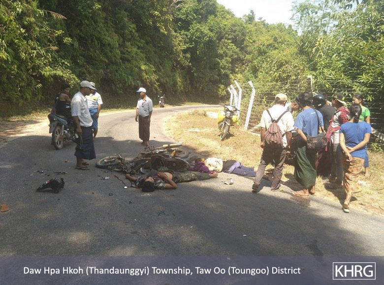 The above photo was taken on May 3rd 2016 in Thandaunggyi Township, Toungoo District by a KHRG community member. It shows two bodies on the road after the collision with the two villagers’ motorbike and one of LIB #124’s trucks. The trucks were transporting their monthly rations from the Southern Command Headquarters to Thandaunggyi Town for their frontline soldiers on May 3rd 2016. [Photo: KHRG]