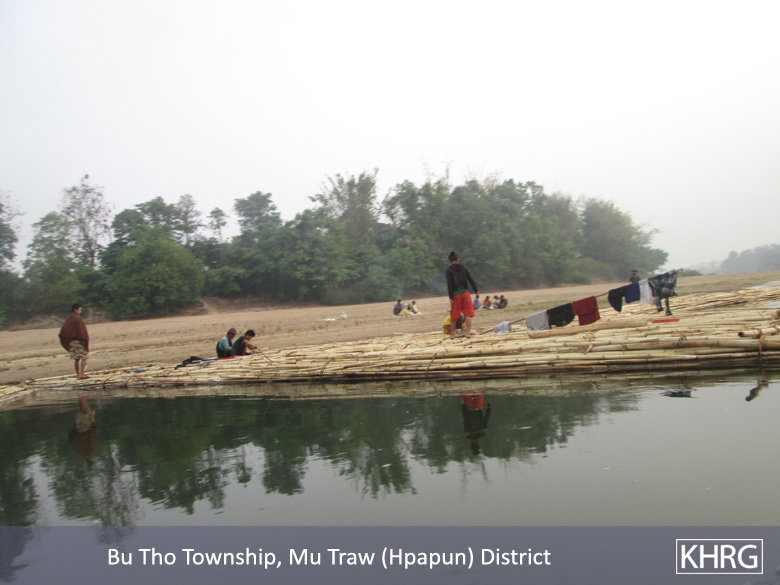 This photo was taken on May 4th 2016 in Htee Tha Daw Hta village tract, Bu Tho Township, Hpapun District. This photo shows villagers moving bamboo on a river to Myaing Gyi Ngu Town to sell them to earn a living. They sell them to those people who do not have bamboo to build their houses. [Photo: KHRG]