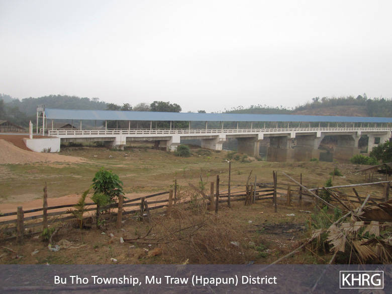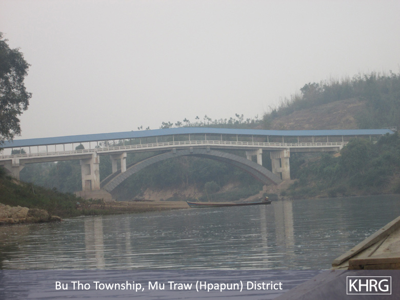 On April 21st 2016 in the evening, the Burma/Myanmar government military [Tatmadaw] Company Commander Myo Myit Myit Aung with 28 members from LID [Light Infantry Division][3] #44 gathered with ten soldiers from Border Guard Force [BGF][4] Battalion #1014[5] led by [Bo[6]] Maung[7] Chit[8] [and they] went to Htee Lah Beh Hta Bridge. In total there were 38 people. The villagers did not know why they entered the area. They stayed there on the western side of the bridge at the end of the bridge and checked the villagers who were traveling on the river on motor boats. They started to check the passengers [traveling] from Ler K’Baw to upper parts. They only allowed one sack of rice to be carried in each boat. Starting from Ler K’Baw to lower parts they allowed people [traveling on the boats] to carry two to three sacks of rice because a group of BGF are also based in Ler K’Baw. They asked the passengers some questions. Htee Lah Beh Hta Bridge was built [in October 2015] in Htee Tha Daw Hta village tract, Bu Tho Township. When they [Sayadaw U Thuzana[9] in cooperation with the Democratic Karen Benevolent Army (DKBA)[10]] first decided to build Htee Lah Beh Hta Bridge, they said that it would be [owned by] monks and the DKBA [would also be temporarily based there]. After the construction was completed, [the DKBA left the area and then] the Burma/Myanmar government troops [Tatmadaw] and the BGF came to maintain security at the bridge. It was not clear to the villagers [why Tatmadaw and BGF patrolled at the bridge].
