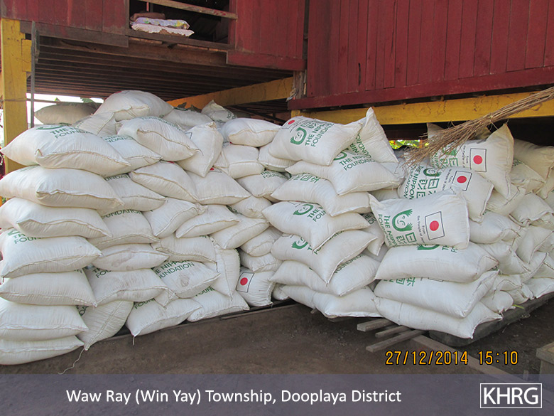 The Last photo was taken in Htee Hpah Htaw village tract, Win Yin Township, Dooplaya District. The Nippon Foundation distributed a bag of rice to each house. It is said that they [Nippon Foundation] deducted three bowls of rice [from a bag of rice] from each house. It was said that they contributed [supplies] to 14 h