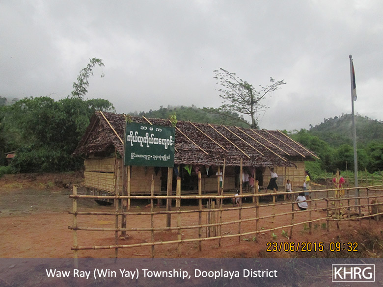 The last photo was taken on June 23, 2015 in Myine Tharya Village, Me Zali village tract, Winyin Township, Dooplaya District. This is a photo of a school locally funded by the villagers, and it is located close to a vehicle road. As it is newly built, school materials such as pens, books, and other school needs are still very limited. [Photos: KHRG]