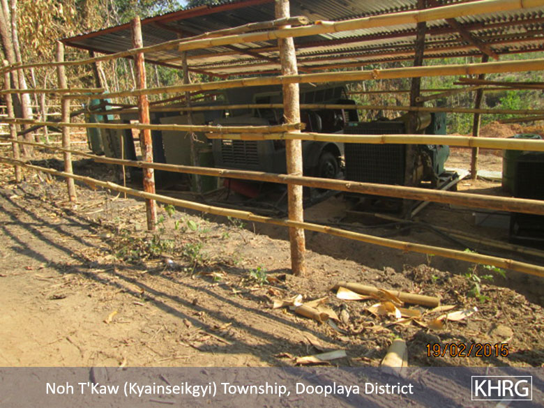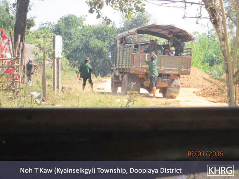 Based on the received information, KHRG found that although the peace process was conducted between Burma/Myanmar military government and ethnic armed groups, the military situation in each Township in Dooplaya District remained as it was in the past, before the ceasefire. For example, there was a military target practice launched by the Tatmadaw Light Infantry Battalion (LIB) #310 on January 19th and 20th 2015 in Kone Myint Thar Yar village, Kone Myint Thar Yar village tract, Win Yin Township. And in Kyainseikyi Township an unknown Tatmadaw battalion transported rations and ammunition to their front line camps on January 16th 2015. In Kawkareik Township the fighting between Tatmadaw and DKBA broke out on the Asian Highway between Kawkareik and Myawaddy Town.