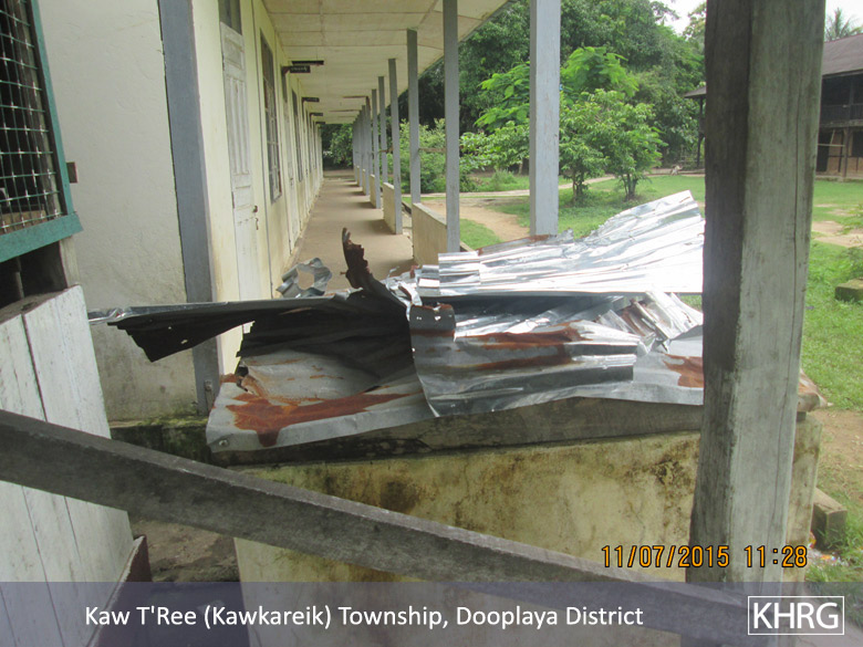 Six months later that year, fighting between Tatmadaw and Democratic Karen Benevolent Army (DKBA)[7] solders erupted on the Asian Highway[8] between Myawaddy and Kawkareik Town on July 2nd 2015, after Tatmadaw soldiers attempted to secure that section of the Asian Highway ahead of the newly built road’s opening ceremony. Tensions between the Tatmadaw and DKBA escalated into conflict when Tatmadaw soldiers ordered the DKBA to remove their base from the Highway. In doing so, the front line military troops (DKBA and Tatmadaw) did not practice the ceasefire Code of Conduct. The ceasefire therefore has not brought peace to the local villagers; instead, the villagers from surrounding areas affected by the fighting were forced to leave their homes. Overall, as a result of the fighting more than 1,000 villagers from more than five different villages in Kawkareik Township temporarily fled their homes and sought shelter at monasteries in Kawkareik Town. Villages were also unable to tend to their paddy fields, and some of their properties were destroyed. Furthermore, schools in these villages were forced to close temporarily out of fears for the safety of the students, who were consequently unable to attend their lessons. On July 7th 2015, a primary school building in Kawkareik Town was hit and damaged by a grenade reportedly fired by two DKBA soldiers. No students or teachers were harmed, as the incident took place at 7 AM, before the school had opened for the day.[9]